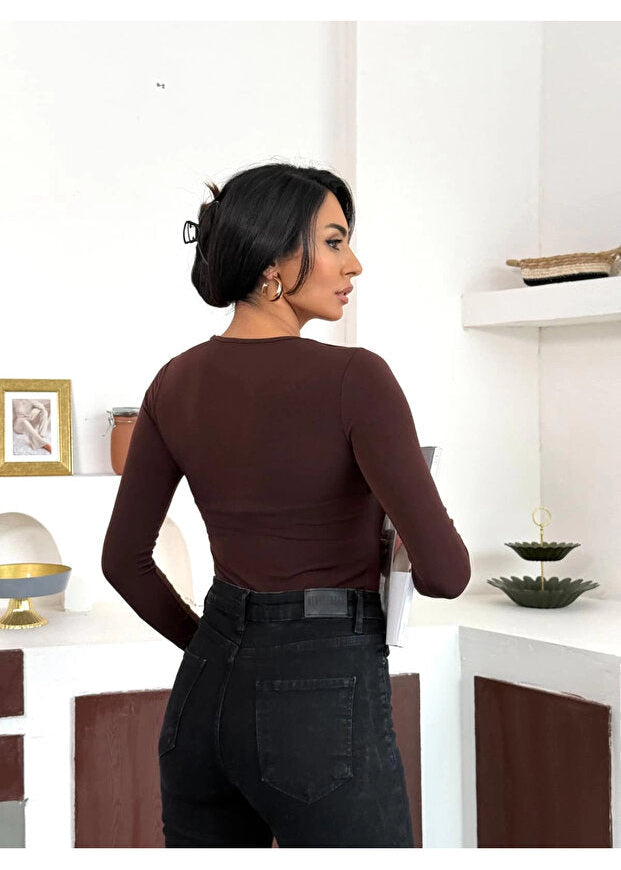 Disponible en marron, bordeaux, noir et vert paon, ce top s’adapte à tous les styles et à toutes les occasions. Ses manches longues et son effet plissé au niveau de la poitrine en font une pièce unique et sophistiquée.