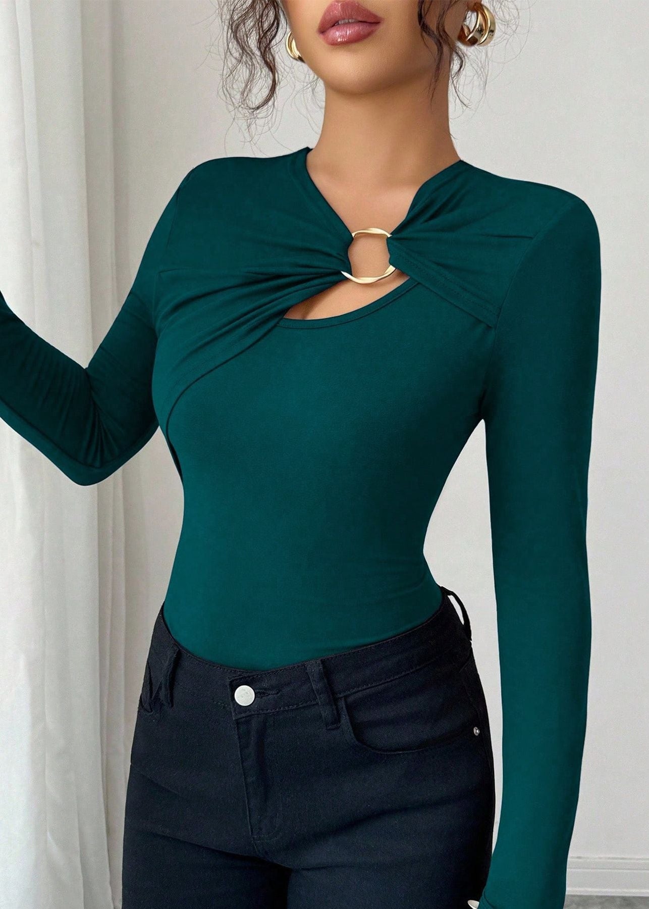 Le Top Élégance Anneau Twist séduit par son design raffiné et sa coupe moderne. Son détail doré à l’encolure ajoute une touche de luxe discret qui sublime votre allure.